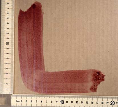 A blood-covered object moving across a surface from top to bottom and then left to right.