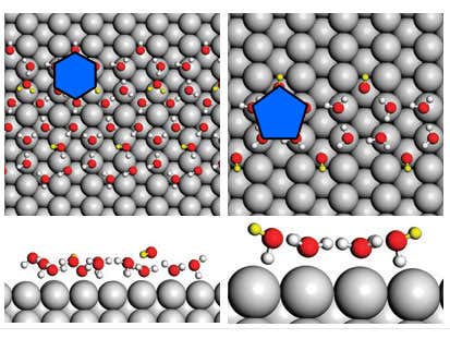 The unusual ice was grown on a copper surface under a vacuum at -173°C. It owes its pentagonal form to the way the water molecules bond with the underlying copper.