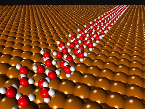 The water molecules (hydrogen in white, oxygen in red) can be seen here, attached to an underlying copper surface (brown spheres).