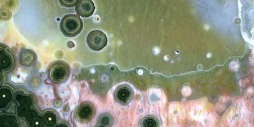 Ocean jasper is a particular type of orbicular jasper, a variety containing many small spheres or “orbs”. The term “ocean jasper” refers to orbicular jasper obtained from the shores of northeast Madagascar: it is a trade name.