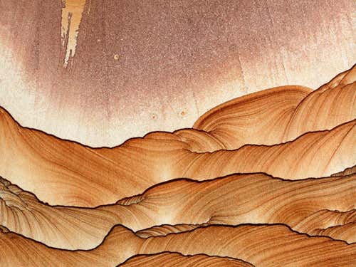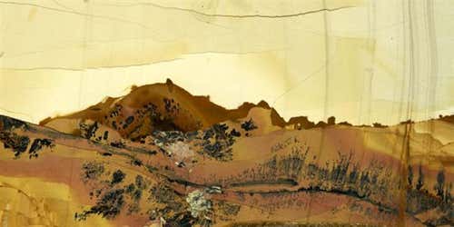 The stone is marked by a 3D network of fine cracks. Groundwater diffuses through these cracks, bringing with it oxides of various minerals. These create the intricate patterns and colours, which often look like landscapes, as in this example.