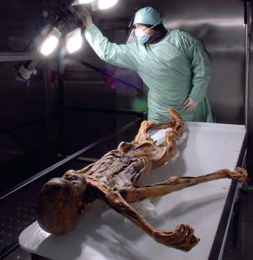 In 2001 an arrowhead found in Ötzi’s shoulder provided another possible cause of death. The wound is visible at the very bottom of this picture, just left of the middle.