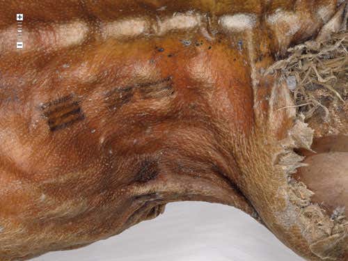 Unlike modern tattoos, they were made by first cutting lightly into his skin, and then rubbing charcoal into the incisions.