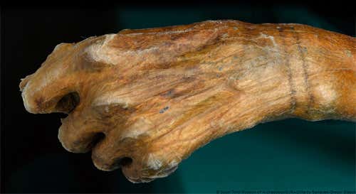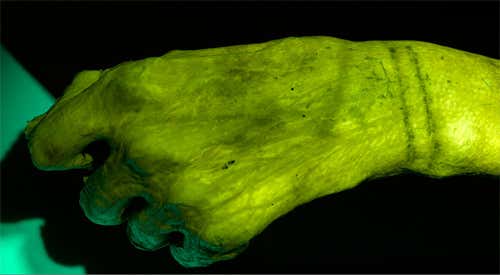 This closeup of Ötzi’s left hand shows two tattoos across the wrist in white light.