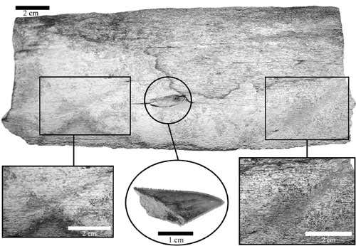 The whale – an undetermined species of baleen whale, or mysticete – did not survive the shark bite. This is evident from a lack of re-growth around the tooth.