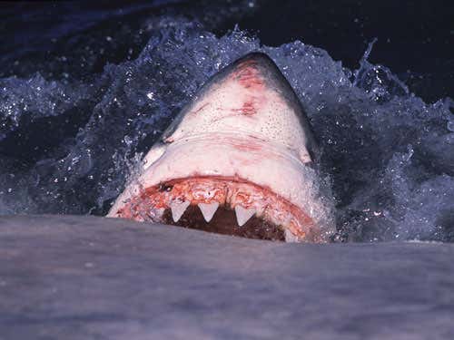 A great white shark, Carcharodon carcharias, feeds on a whale carcass at Seal Island, False Bay, South Africa.