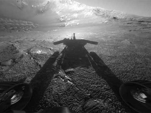 Opportunity took this image of its own shadow in August 2004 as it moved into the Endurance Crater.