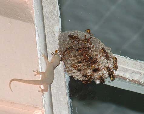 What’s more, as this photograph shows, if these wasps leave their nest unguarded, geckos may eat the entire nest to get to the larvae.