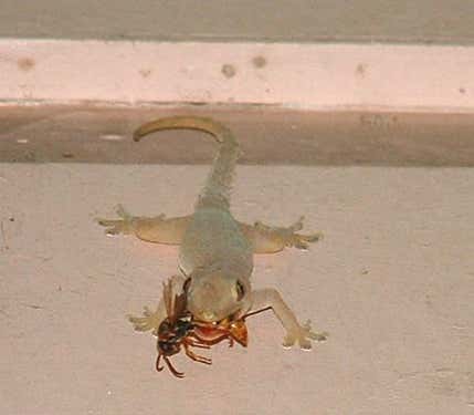 He told The Last Word that Asian geckos like the one pictured also feast on Polistes; wasp species that are about 15 millimetres long and have a very nasty sting.