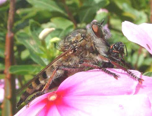 “Robber flies can grow to more than 2 centimetres long and are quite fearsome in appearance, with orange tufts of hair around the face that are thought to protect them from their prey.