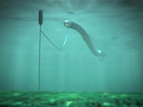 Waves create travelling pressure waves inside the Anaconda, driving a generator in the tail.