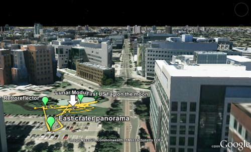 Download a Google Earth file to see all the Apollo landing explorations superimposed over Cambridge.
