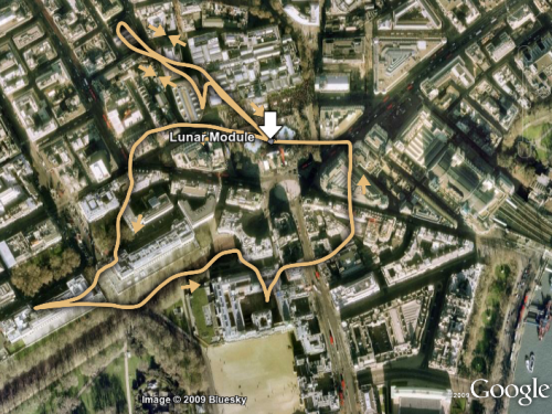 The south-west point of their exploration is 400 metres from their landing point and en route to Buckingham Palace, a total of 1200m away, when superimposed on London’s streets.