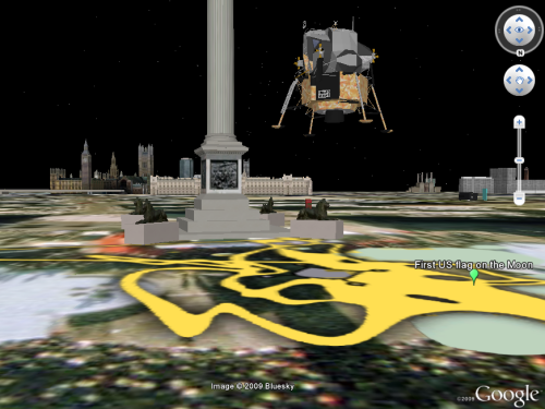 A to-scale model of the Apollo 11 Lunar Module in London’s Trafalgar Square, with Big Ben and the UK parliament in the background. The yellow areas show ground walked on by Neil Armstrong and Buzz Aldrin; the pale blue areas are craters.