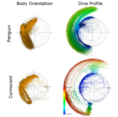 The body orientation plots (left) of penguins and cormorants are similar – but adding the data from depth sensors reveals their behaviour to be very different.
