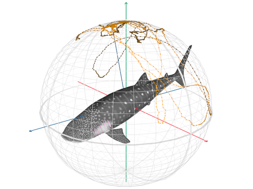 This 3D plot shows the orientation of an animal’s body in the water over time, in this case for a whale shark.