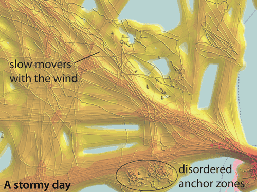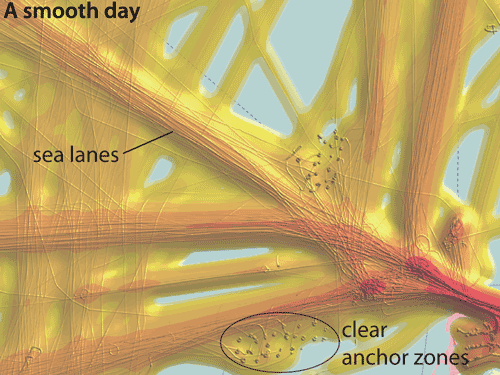 On a rough day it is clear that the shipping lanes have broken down, and that shipping density doesn’t get so high.