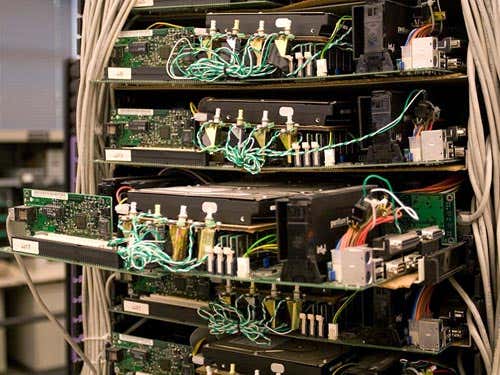 This server, from around 1999, was one of about 30 made by Google founders Larry Page and Sergey Brin by connecting desktop computer components.