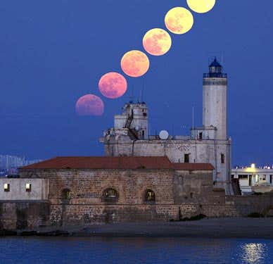 The full moon rises above a lighthouse on the Mediterranean Sea in Algiers, Algeria. (Image: Babak Tafreshi)
