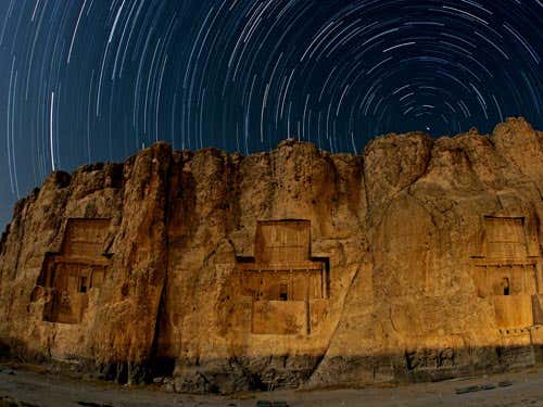 This hour-long exposure shows the circular trails stars make as a result of the Earth’s rotation. In the foreground, 2500-year-old tombs of ancient Persian kings tower high above a site near Persepolis in southern Iran. (Image: Babak Tafreshi)