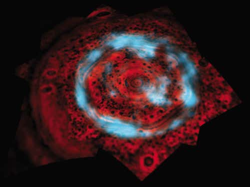 The north pole of Saturn is covered by a bizarre hexagon-shaped storm (shown in red in this infrared image of the planet, with its aurora in blue). Parts of this feature were detected by the Voyager mission in 1980, but Cassini snapped the first full views of the weather system, which spans nearly 25,000 kilometres – the width of two Earths.