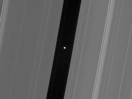 Small moons carve gaps in Saturn’s rings. But Cassini has found the rings are also scattered with “moonlets” that are too lightweight to clear a path. Some of these moonlets are too small for Cassini to see directly, but they can be identified by propeller-shaped disturbances (pictured) that they create in the ice and dust that surrounds them.