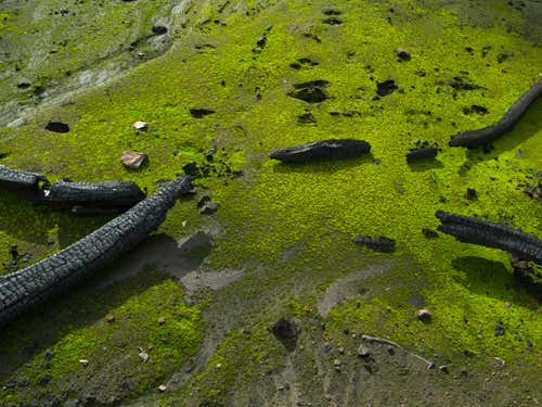 Four months after the fire, photographer Lloyd Godman visited one of the worst hit areas, Kinglake, north east of Melbourne. Regeneration was in its early stages and a carpet of emerald green moss had returned to the burnt forest floor. Bushfires can severely damage the undergrowth, but thanks to the high moisture content of moss, enough can survive the flames to make regrowth possible.