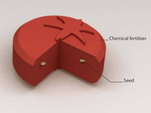 The designers point out that to novice gardeners, most vegetable seeds can look alike. To help aid recognition, the fertiliser “shell” is designed to match the seeds within – in this case, tomato seeds.