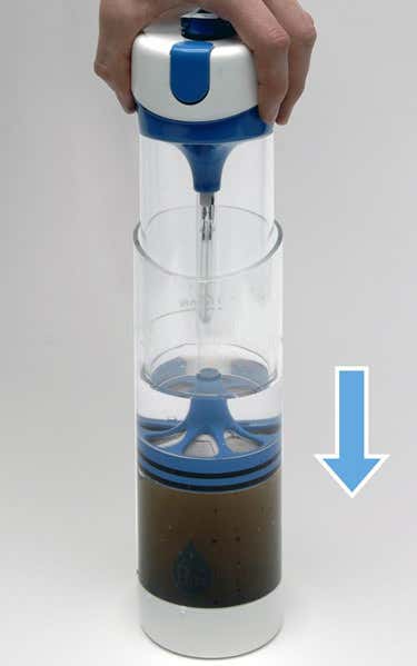 The bottle contains a cafetière-like plunger to filter out particles larger then 4 micrometres. The clear water is then sterilised using a UV bulb powered by a wind-up generator. After 90 seconds, the water is safe to drink.