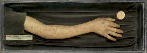A wax model showing smallpox pustules ravaging a person’s arm.