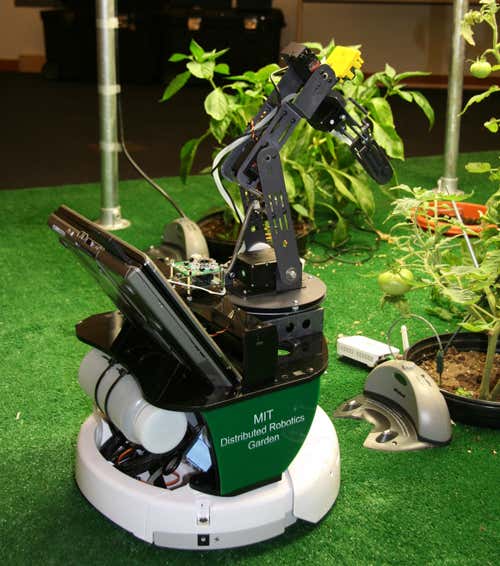 Students at Massachusetts Institute of Technology have designed a “distributed robotics garden”: four cherry tomato plants, each with its own sensors, tended by six small robots. The robots and plants communicate through a wireless network, with the plants monitoring their own soil humidity and calling for water when necessary. As well as keeping the soil moist, the robots detect when tomatoes are ripe and pick the fruit.