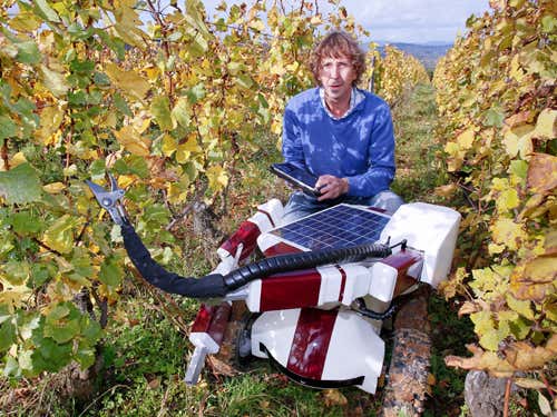 Engineer Christophe Millot has designed “Wall-Ye” to prune vines. The small robot, with four wheels and two metal arms, has GPS sensors and six web cameras, and can trundle between vines, test the soil and check grapes. Eventually Millot hopes Wall-Ye will be able to prune up to 600 vines per day.