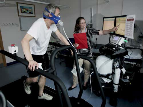 Time to measure how fit (or not) I am. First I’m fitted with a belt carrying sensors and electrodes that will measure how efficiently I burn oxygen. Then the treadmill. I’ve never been on one of these before (except the one called the news department at New Scientist). It starts off at a stroll, builds to a canter and ends in a heart-pounding frenzy, not helped by the clippy thing on my nose that forces me to breathe through my mouth into the attachment. But I manage to survive, even when it feels like I’m in the Grand National. Metabolic assistant Laura Watson is pointing approvingly to the chart, telling me my peak oxygen consumption is normal. Or something. I’m too tired to take it in!