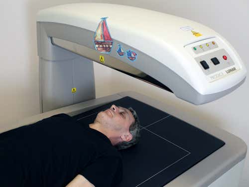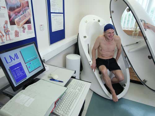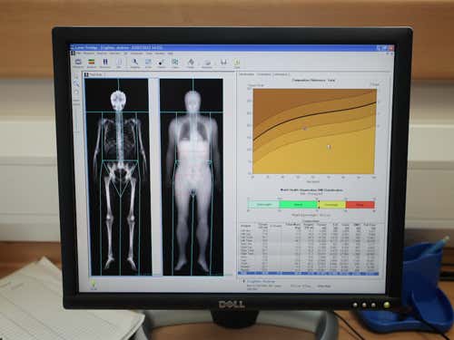 Not a death ray, thank goodness, but a Dual-Energy X-ray Absorptiometry (DXA) scan. It measures the relative amounts and distribution of fat, lean and bone tissue, which are important for working out how efficiently you burn energy. The scanner gradually runs over your entire body, revealing what’s inside by passing very low-energy X-rays through it – equivalent to the amount of radiation you’d absorb from cosmic rays during a flight in Europe. Very restful, as the scanner makes gentle humming sounds as it trundles down the bed.