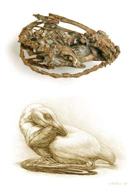 Mei long or “soundly sleeping dragon” provided a rare glimpse into the behaviour of bird-like dinosaurs when Xu Xing and colleagues uncovered this well-preserved goose-sized fossil in Liaoning province in 2003. Mei long was resting with its head nestled under one of its forelimbs, like a modern bird with its head under its wing. It was probably buried alive under volcanic ash 125 million years ago.