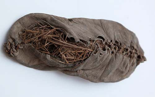 The oldest intact garment is a shoe dating from about 5500 years ago. Discovered in a cave in Armenia, it is made from a single piece of cowhide laced at the front and back with leather cord.