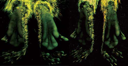 The feet of the first transgenic marmosets, Kei (left) and Kou, glow under UV light. They were created at Keio University in Tokyo, Japan, last year.