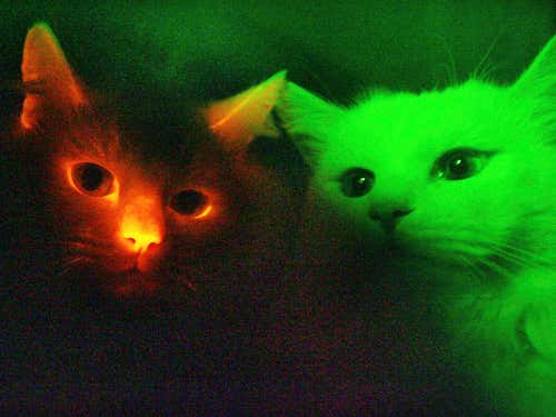 The fluorescent cat on the left, whose skin glows in ultraviolet light, is one of two created at Gyeongsang National University in Jinju City, South Korea, in 2007.