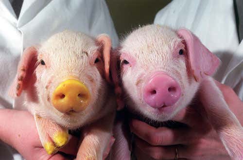 The yellow skin and trotter of the pig on the left is due to an added fluorescent jellyfish gene. Other transgenic pigs have less visible but more useful traits. For instance, the “Enviropig”, created at the University of Guelph in Ontario, Canada, excretes far less phosphorus than normal pigs.