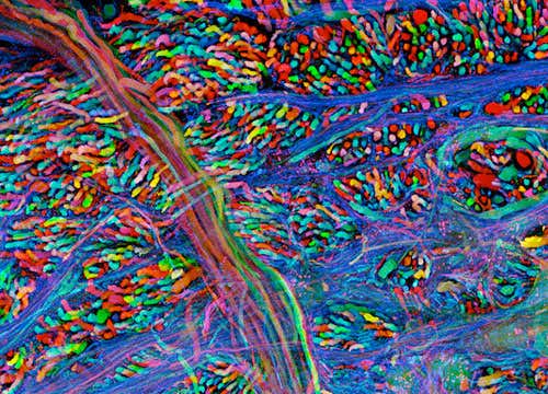 Brain cells glow with different colours under UV light in this image of the brainstem of a “Brainbow” mouse.