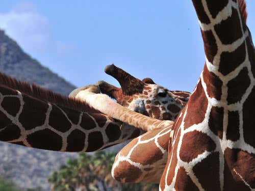 Giraffes may not look like fighters, but males will try to physically subordinate their rivals. Here we see two males engaged in what Dale Peterson describes as “a kind of giraffe ju-jitsu”, with one male trying to topple another using its legs. They also use their necks to deliver blows.