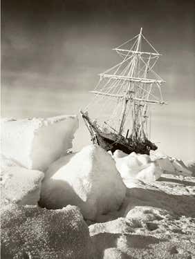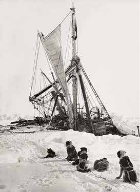 The Endurance in its death throes, as it succumbs to the ice. The pressure of ice on the ship forced it over at a precarious angle; on the day before this photo was taken she began to leak, finally sinking a little less than a month later.