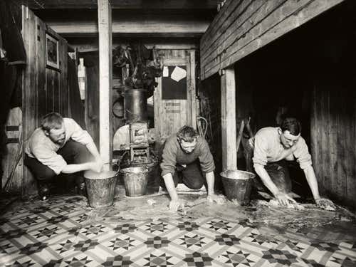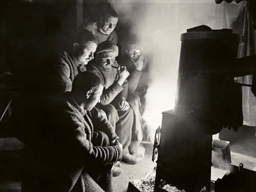 Shackleton’s men seem relaxed as they huddle round the fire.