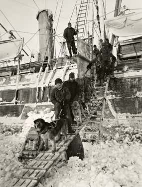 The dogs were amazingly strong and needed at least one handler each. Restraining them and posing on the slippery gangplank would have been a nightmare, but like Ponting before him, Hurley would have thought it important to document the minutiae of everyday life.