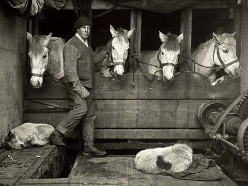 Lawrence Oates and Siberian ponies on board Terra Nova, 1910