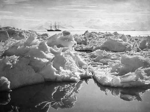 A few days after the ship made landfall in the Antarctic, Ponting stood on the unstable ice floes and took this photograph. The day was extremely calm and the ice in the last stages of melting, making any further approach extremely treacherous.