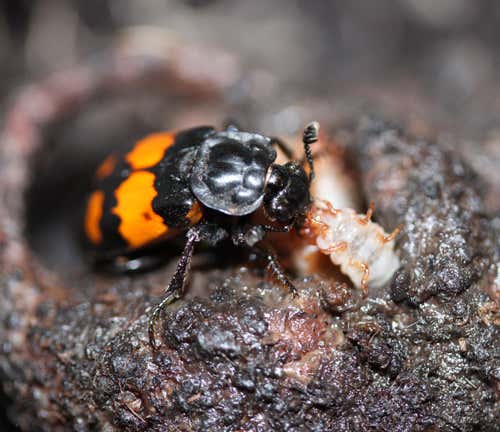 Squeamish readers might want to look away: this is a tale of decaying corpses, regurgitation and feasting on putrefaction. It is also an account of some excellent parenting skills. We’ve all seen baby birds begging their parents for food. The larvae of the burying beetle Nicrophorus vespilloides do it too, only their diet is… well, slightly different.