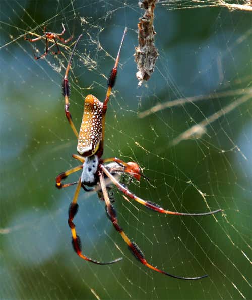 Pretty name, not-so-pretty domestic arrangements. The golden orb-weaving spider Nephila clavipes has the unpleasant habit of weaving rotting insect carcasses into its web. What possesses it? The gruesome behaviour isn’t unique: many spiders add cadavers to their web designs. Some studies suggest the whiff of rotting carrion is designed to lure insects to their doom, whereas others conclude that the corpses ward off predators.