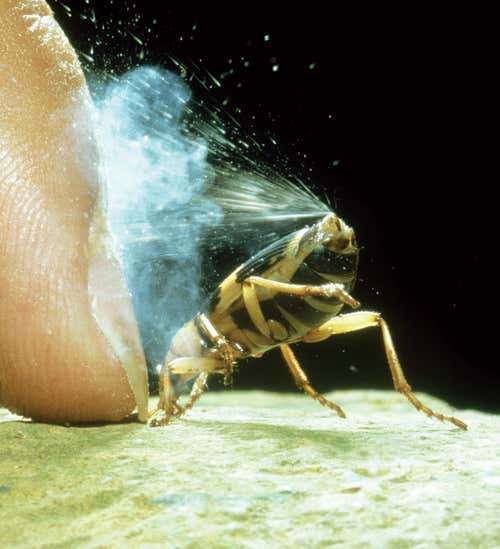 Chemical warfare is frowned upon in most human societies, but to animals it’s routine. Bombardier beetles have glands in their abdomens which can shoot rapid-fire pulses of hot caustic liquid. Each gland has two chambers, one containing a mixture of hydroquinones and hydrogen peroxide, the other various enzymes. When the two are mixed, a series of explosive reactions occur, including the conversion of hydrogen peroxide into oxygen and water. These reactions heat the mixture to boiling point and blast it out of the beetle’s backside with an audible pop.