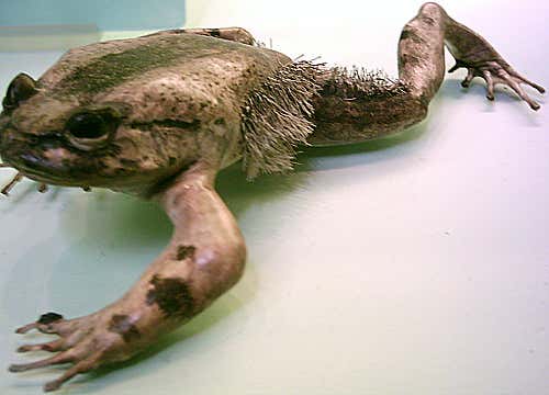 Hairy frogs from the Cameroon have revealed a remarkable mechanism that causes thorn-like claws to burst through the skin when it is threatened. Trichobatrachus robustus actively breaks its own bones to produce claws that puncture their way out of the frog’s toe pads.